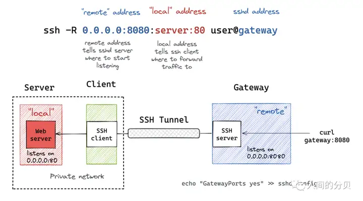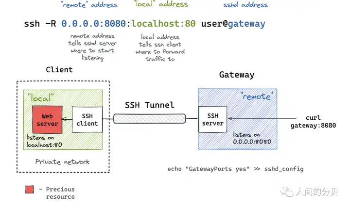 默认情况下,上述 SSH 隧道将仅允许使用网关的 localhost 作为远程地址。换句话说,您的本地端口仅从网关服务器本身内部可访问,这很可能不是您实际需要的。例如,我通常希望使用网关的公共地址作为远程地址,以将我的本地服务暴露给公共互联网。为此,需要使用 GatewayPorts yes 设置配置 SSH 服务器。