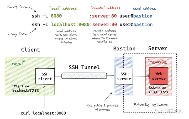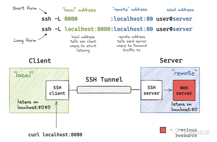 一开始可能不太明显,但是 ssh -L 命令允许将本地端口转发到任何机器上的远程端口,不仅仅是 SSH 服务器本身。请注意,remote_addr 和 sshd_addr 可能具有相同或不同的值: